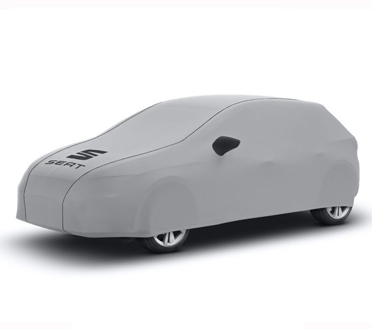 Housse tissu élastique en polyester avec fil protecteur contre les torsions et les froissements. Housse noire avec bordures et rétroviseurs de couleur noire, le logo de SEAT est sérigraphié à l'avant et le nom du modèle sur la partie arrière. Cet accessoire est applicable à la Leon Cupra