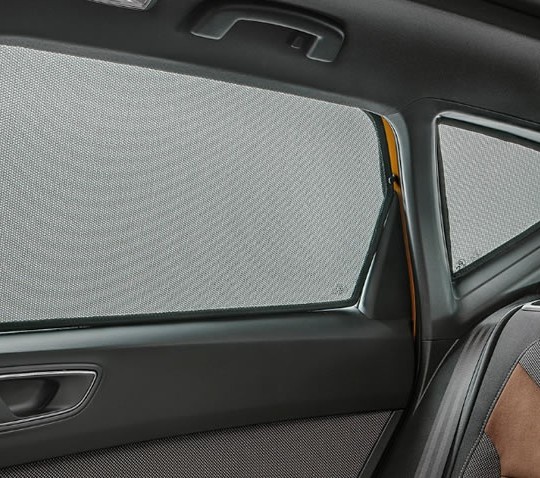 Rideaux de protection pour fenêtres latérales, à la fois pour les portes et glaces de custode arrière, exclusifs sur ce modèle. Les rideaux offrent une protection contre le soleil dans la zone des passagers arrière, tout en améliorant les conditions climatiques du véhicule. Ensemble composé de 4 rideaux