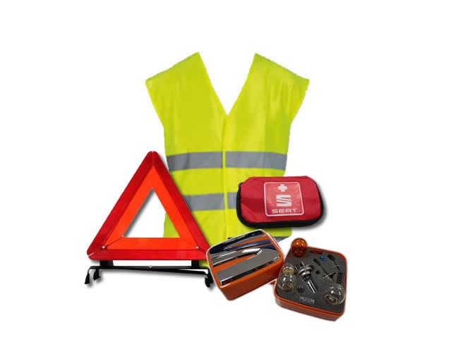 Comprend : Triangle de présignalisation Gilet réfléchissant de couleur jaune Trousse de secours Boîtier d’ampoules H4