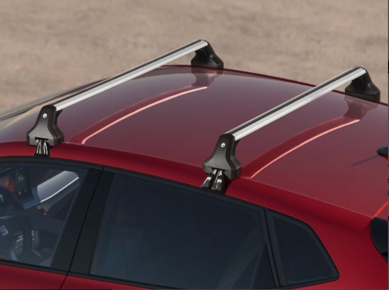 Ensemble de barres de transport avant et arrière. NON valable pour les versions avec toit panoramique. Les barres se fixent sur le toit du véhicule et disposent d'un système antivol. Charge maximale sur le toit de 75 kg. Valable uniquement pour les véhicules produits à partir de la semaine 31 (2018).