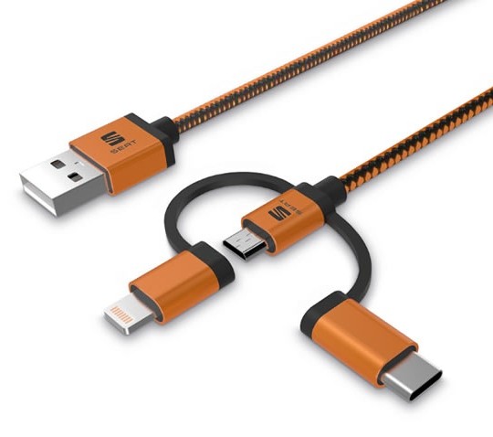 Profitez de vos voyages pour recharger vos dispositifs ou transférer vos données simultanément avec ce câble au design 3 en 1 MFI, doté de trois types de câbles USB différents : USB-C, micro-USB et câbles Lightning (Apple). Votre SEAT est compatible avec votre monde : iPhone XS / XS Max / XR / X / 8/8 Plus / 7/7 Plus / 6/6 Plus, iPad Pro 12.9, 10.5, iPad de 4e génération, iPad mini, mini 2, mini 4.