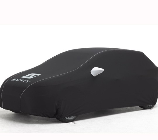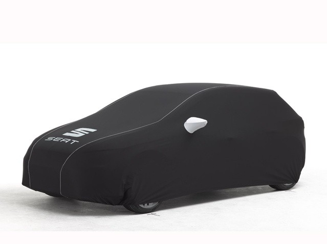 Housse tissu élastique en polyester avec fil protecteur contre les torsions et les froissements. Housse noire avec bordures et rétroviseurs de couleur grise, le logo de SEAT est sérigraphié à l'avant et le nom du modèle sur la partie arrière. Cet accessoire est applicable à la Leon Cupra