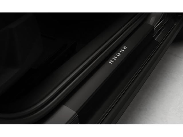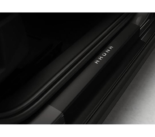 Feuille adhésive noire, avec le nom du modèle, adaptée à la forme du seuil de porte pour protéger les zones d'accès des passagers. Instructions et éléments de montage inclus.