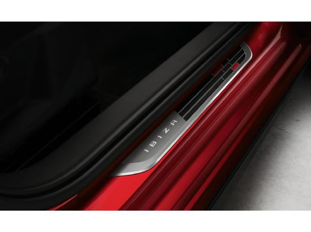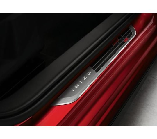 Kit de deux seuils de porte en acier inoxydable placés sur le flanc des portes avant avec du ruban adhésif. Personnalisés avec le design « Speed ».